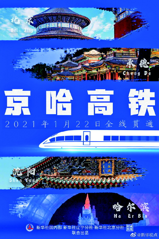北京至哈尔滨高铁北京至承德段(京哈高铁京承段)将于2021年1月22日开通运营,京哈高铁实现全线贯通,北京至沈阳、哈尔滨最快2小时44分、4小时52分可达。