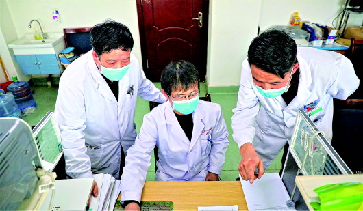 1月15日,天津市肿瘤医院结直肠专业副主任医师汤思哲(中)与甘南州人民医院医生讨论病例。新华社记者张睿摄