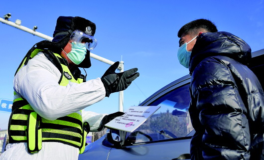 在通化市高速公路口,执勤交警对出城车辆人员进行检查登记(1月18日摄)。 新华社记者许畅摄 |