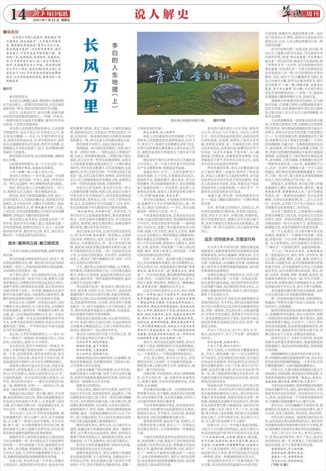几乎每个中国人的童年,都背诵过“举头望明月,低头思故乡”,几乎每个中国学生,都在课本里读到过“黄河之水天上来,奔流到海不复回”,它们的作者李白,唐代著名诗人,千百年来在中国家喻户晓。李白的一生,或因前途,或因游历,或因流放,自24岁离开家乡四川,就一直处于奔波迁徙中,足迹遍布大半个中国。草地周刊将分上中下三部分,推出长稿《长风万里》,作者走访了1000多年前李白停留过的那些地方,从文学和地理的角度,将李白的一生娓娓道来。