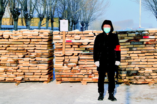 1月15日,在黑龙江省绥化市望奎县后三乡厢白七村,志愿者在卡点前值班。