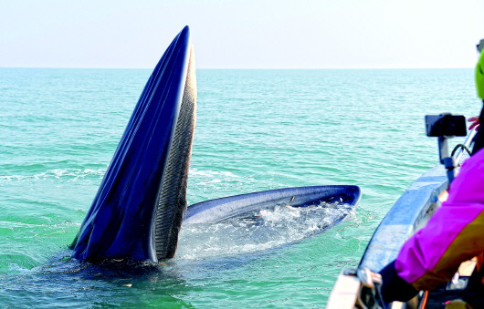 1月15日,布氏鲸在捕食过程中靠近科考船。在当天的考察中,布氏鲸罕有地在早已关闭马达的科考船周围频频出水捕食。陈默说如此近的距离在几年的考察中都没有过。 |