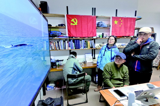 1月13日,陈默(右一)和张瑶瑶(右三)在观看徐健(右二)当天拍摄的布氏鲸。 |