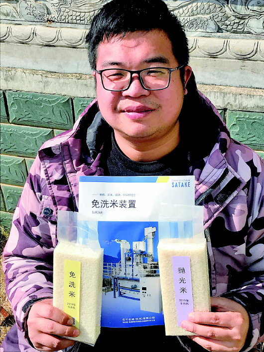 丁旦展示市场上免洗大米产品和生产技术。 本报记者陈春园摄 |