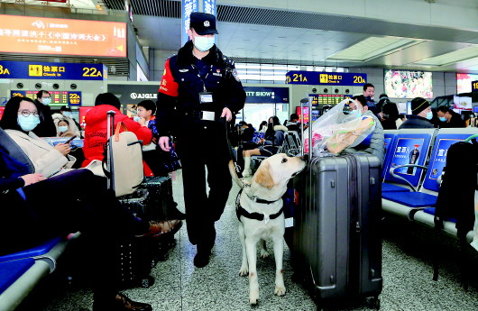 1月28日,上海虹桥火车站派出所民警携警犬在候车大厅巡逻。 新华社记者凡军摄