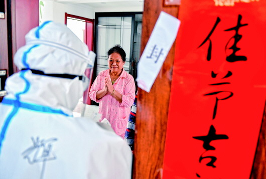 1月31日,在吉林省通化市东昌区一小区,居民向入户进行核酸采样的医务人员表示感谢。1月30日8时起,通化市组织1030个核酸采样小组在高风险区域东昌区开展重点人群精准集中检测工作。新华社记者许畅摄