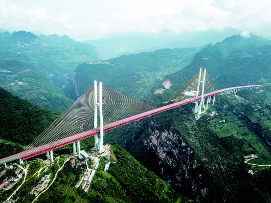 云贵边界,全长1341米、距江面565米的北盘江大桥,似一道彩虹横跨峡谷之上,近200层楼的高度标记着世界第一高桥的奇迹。但很多人并不知道,这座“世界级超级工程”所用钢丝绳均出自本土企业贵州钢绳股份有限公司。