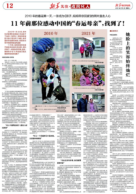 新华社成都2月3日电(记者吴光于)11年前,一张“春运母亲”的照片击中人心。背着巨大行囊,左手提包,右臂中还揽着一个婴儿的身影成为当年感动无数人的“春运表情”。