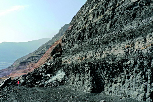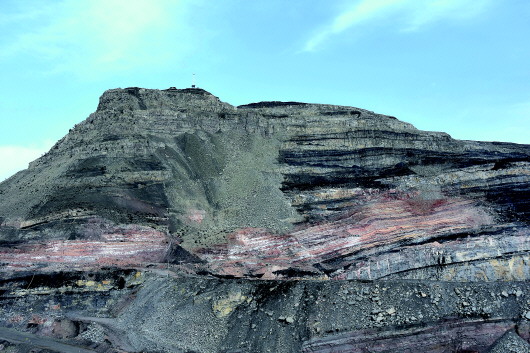 环顾四周,一些山头已经被烧塌,山体表面也由原来的青灰色变成了红褐色,眼前一座130米高的山体就像丹霞地貌。
