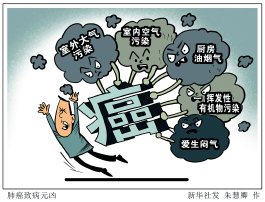 中国抗癌协会科普专业委员会主任委员、首都医科大学肺癌诊疗中心主任支修益,将肺癌致病元凶归结为“五气”,即室外大气污染、室内空气污染、厨房油烟气、挥发性有机物污染以及爱生闷气。