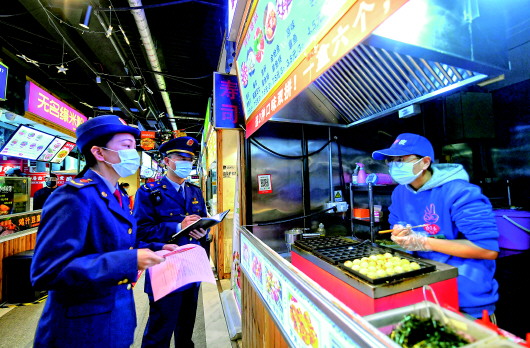 2月4日,石家庄市桥西区市场监督管理局工作人员在桥西区夜未央吃街了解商户运营情况。