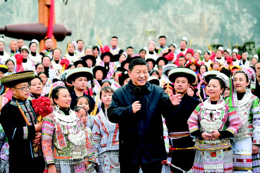 村文化广场上,乡亲们正在开展春节民俗活动,打起鼓、吹芦笙,载歌载舞,唱起了欢快的苗家迎客歌。看到总书记来了,大家齐声欢呼“总书记好”。习近平亲切地对乡亲们说,今年我们将迎来全面建成小康社会、实现第一个百年奋斗目标的伟大胜利。中华民族是个大家庭,五十六个民族五十六朵花。全面建成小康社会,一个民族不能落下;全面建设社会主义现代化,一个民族也不能落下。脱贫之后,要接续推进乡村振兴,加快推进农业农村现代化。希望乡亲们继续努力奋斗,把乡村产业发展得更好,把乡村建设得更美。临别时,乡亲们依依不舍簇拥着总书记,齐唱苗家留客歌,深情的歌声在乌江上空久久回荡。
