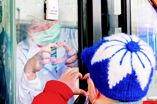 2月11日,在哈尔滨市道外区一集中隔离点,郑莹莹和儿子顺顺隔着玻璃门“比心”。