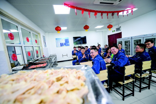 2月11日,在锡盟换流站的食堂,职工们欢聚一堂准备吃过年水饺。