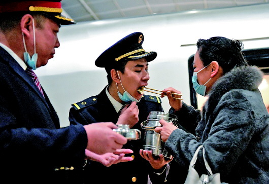 太阳刚刚露面,张岩、刘晓峰换上蔚蓝色的制服,走进了中国铁路北京局集团有限公司天津机务段南仓运用车间的员工食堂。大饼鸡蛋配豆浆,简单的早餐陪两人迎来了除夕的清晨。