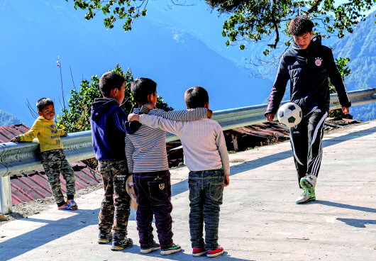 旺前罗布的家在县城以西的德兴乡巴登则村。他记得,小时候踢的“球”是用胶带缠住的纸团,有时也用瓶子代替。只能在村头的土广场上踢,但不敢开大脚,因为“球”会掉到山下。