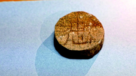 甘肃简牍博物馆整理研究部主任肖从礼介绍,该文物出土于敦煌悬泉置遗址,直径为5.3厘米,厚度为1.5厘米,两面分刻有“忠”“情”二字,边缘并不规整。专家推测,它或许是一个常见器皿的盖子。