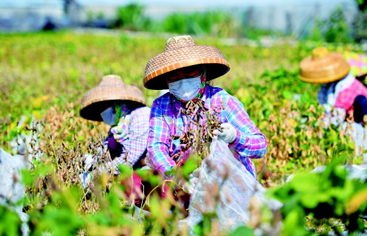 工人在采收中国农业科学院油料作物研究所在三亚繁育的大豆(二〇二〇年二月二十七日)。中央一号文件对打好种业翻身仗做了顶层设计和系统部署,涉及种质资源保护、育种科研攻关、种业市场管理。 新华社记者郭程摄 |