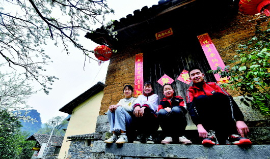 在广西融安县东起乡崖脚村铜板屯,龙璐婷、龙璐莹、龙紫贤、龙杰(从左至右)在屋前合影(2月15日摄)。 |