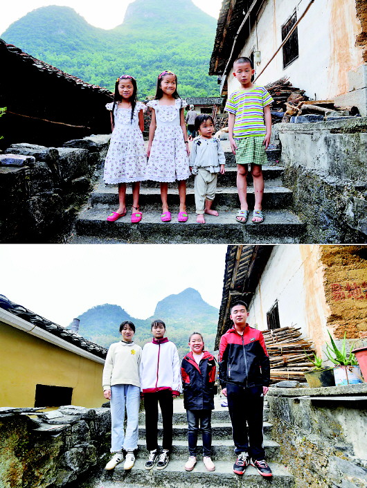 龙璐婷、龙璐莹、龙紫贤、龙杰(从左至右)在铜板屯的合影(上图摄于2013年7月23日,下图摄于2021年2月15日)。 新华社记者黄孝邦摄 |