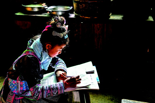 13岁的潘努阶抱着书本从陡坡上的家中下来,喊上同伴潘污简,一同走进村路边的潘乃党家。3位同读六年级的女孩在一张方桌旁坐下,打开书本开始做作业。“一天一章,我们得按时把寒假作业做完,新学期开学交给老师检查。”潘努阶说,相约学习,是她们近年来养成的习惯。