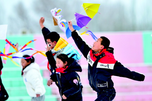 童心逐梦”主题活动,师生踏着春雪,放飞寒假里自制的风筝,开启新学期。