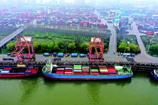 2月28日,停靠在码头的“汉海5号”准备首航驶往上海洋山港(无人机照片)。