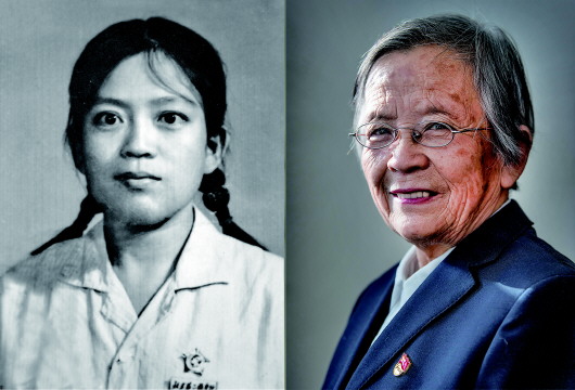 拼版照片:左图为1968年12月北京第二医学院毕业时的路生梅(资料照片);右图为2021年1月18日在佳县窑洞接受采访的路生梅。 新华社发