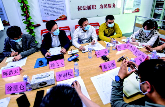 2月25日,在深圳富士康科技集团,杨飞飞(左二)与产业工人、农民工代表等交流,听取意见和建议。