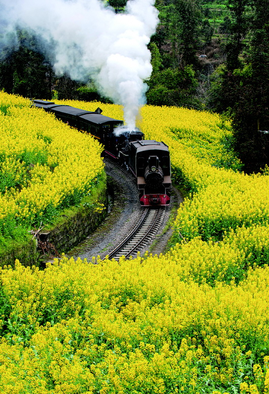 3月2日,一列嘉阳小火车经过段家湾蜜蜂岩的油菜花海。