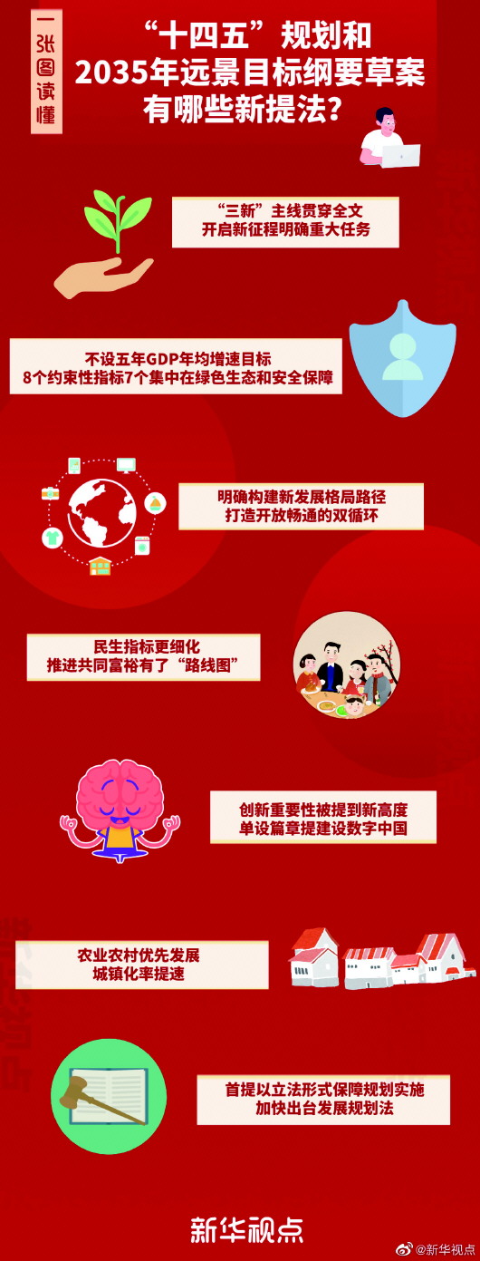 规划纲要草案共19篇、65章,作为指导今后5年及15年国民经济和社会发展的纲领性文件,新发展阶段、新发展理念、新发展格局的“三新”主线贯穿全文,鲜明彰显高质量发展的主题。