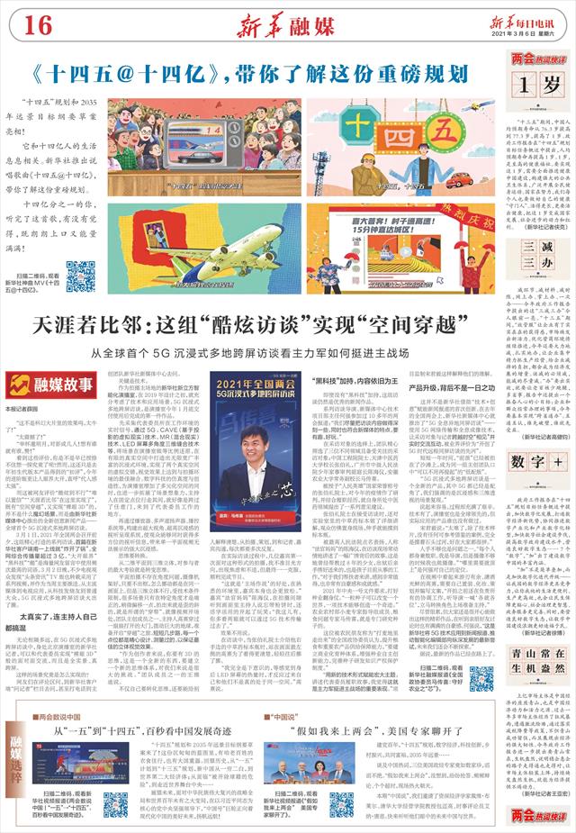 这并不是新华社借助“技术+创意”赋能新闻报道的首次创新。在去年的全国两会上,新华社新媒体中心就推出了“5G全息异地同屏访谈”——使用5G网络传输和全息成像技术,让采访对象与记者跨越时空“相见”并实时交流互动,被业界评价为“开创了5G时代远程同屏访谈的先河”。