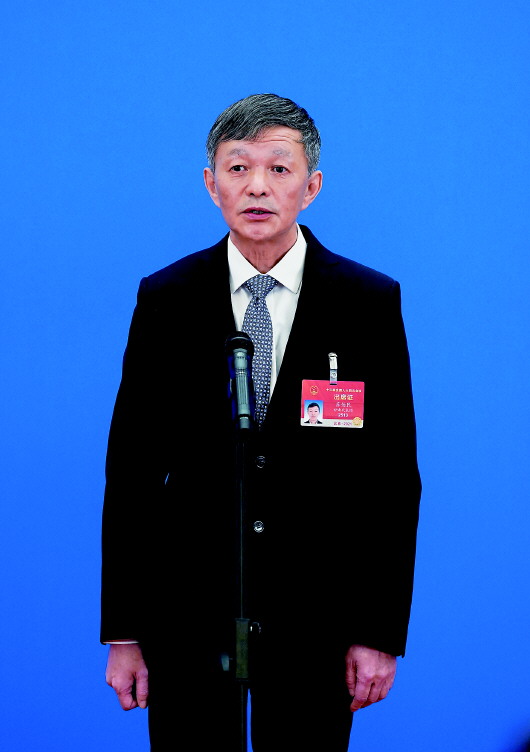 3月5日,苏伯民代表通过网络视频方式接受采访。 新华社记者才扬摄 |