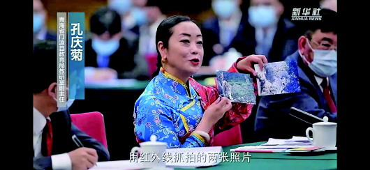 在青海代表团审议现场,全国人大代表、青海省海北藏族自治州门源回族自治县教育局教研室副主任孔庆菊展示了两张特殊的“猫”照。 新华社视频截图
