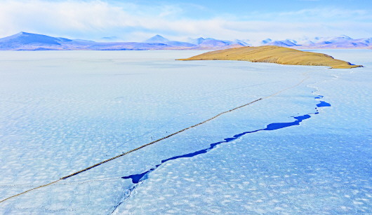 每年高原最冷的时刻,普莫雍错封冻成冰湖。