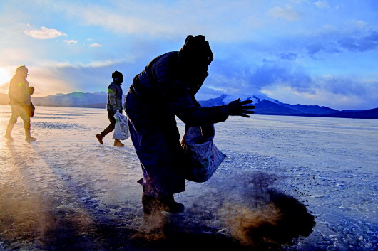 村里的老者凭借多年经验,反复查看冰面,最终会选择冰封最厚的地方,指挥主妇们撒上牛粪炉灰。