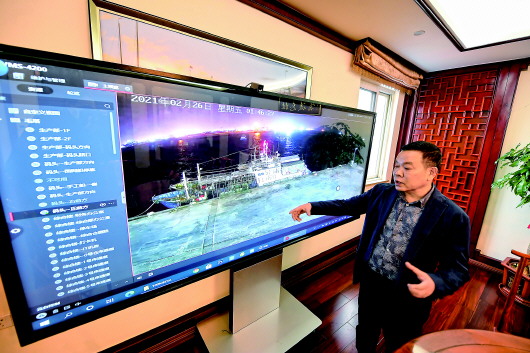2月26日,兰平勇在公司总部通过视频连线介绍西非毛里塔尼亚远洋渔业基地建设和捕捞情况。