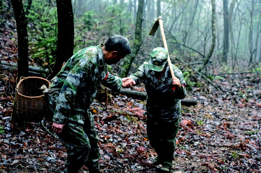 3月9日,在瓦上管护站林区内巡山护林途中,洪晓春(前)在上陡坡时拉着妻子黄淑萍。