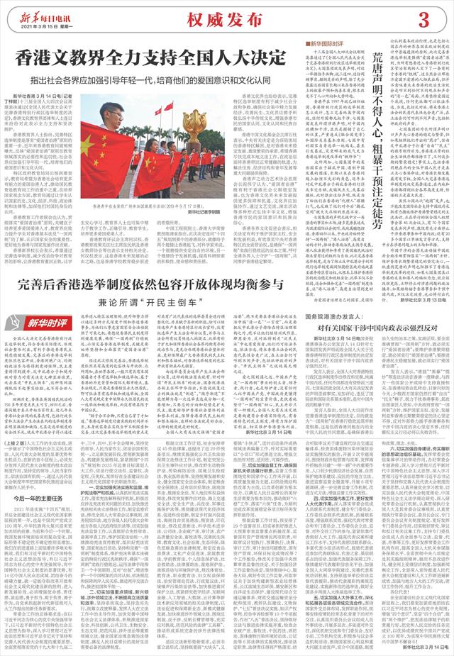 发言人指出,全国人大日前作出完善香港选举制度的决定,目的就是为“一国两制”在香港行稳致远筑牢制度根基。这是包括香港同胞在内的全中国人民的共同意愿,是确保香港长治久安的治本之策。实践证明,要全面准确贯彻“一国两制”方针,就必须实行“爱国者治港”;要维护香港繁荣稳定,就必须实行“爱国者治港”;要推进香港民主稳健发展,就必须实行“爱国者治港”。