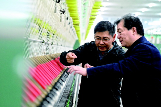 ![]() 3月12日,赵化录(右)走访了解辉县市华兴纺织有限公司生产经营情况。 新华社记者张浩然摄 |