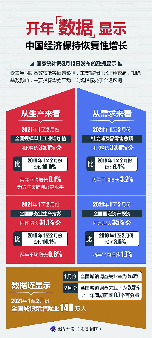 据新华社北京3月15日电(陈炜伟、刘文昕)国家统计局15日发布的数据显示,1至2月份国民经济保持恢复性增长。国家统计局新闻发言人刘爱华说,受去年同期基数较低等因素影响,主要指标同比增速较高,扣除基数影响,主要指标增势平稳,宏观指标处于合理区间。
