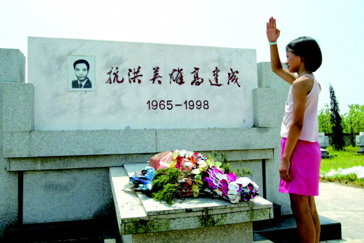 2002年8月29日,江珊向设立在湖北省嘉鱼县簰洲湾民垸中堡村村边的“抗洪英雄高建成”烈士墓致敬。 新华社资料照片