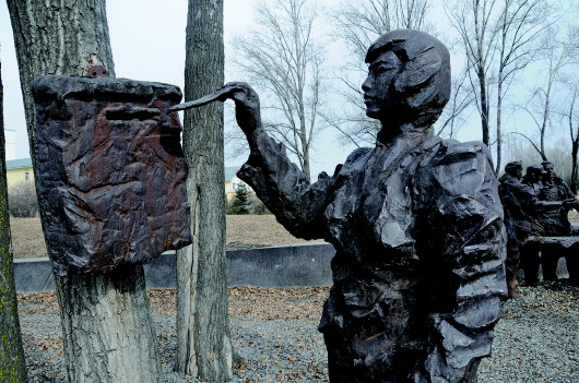 在原子城纪念园里的这座雕塑,生动再现了那个火热年代中,一个真实而感人的故事。