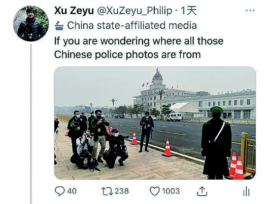 徐泽宇将抓拍到的外媒记者拍摄武警照片上传到自己的推特账号。 |