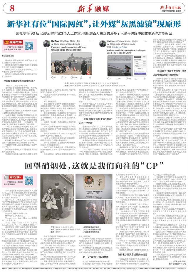 在海外社交媒体上,徐泽宇用“新华社记者”的身份,在个人账号上对国内外重大热点事件快速发声,在海外粉丝群体中积极发挥舆论引导作用,正面、积极地树立中国形象、传播中国故事。