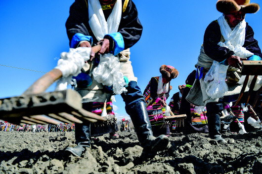 3月16日,克松社区居民在参加春耕仪式。当日,西藏多地举行春耕仪式,山南市乃东区昌珠镇克松社区居民把装扮一新的拖拉机开到农田里,人们身着节日盛装齐聚田野,在古老的《春耕之歌》的悠扬旋律中举行春耕仪式。