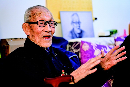 曾担任八五〇农场生产队队长、如今105岁的郭德福在介绍当年情况(3月4日摄)。     新华社记者王建威摄