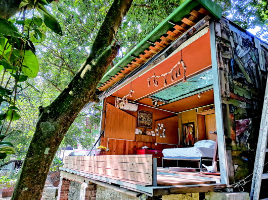 槟榔花混着柚子花香,沿一条小道深入数十米,鸭坡村的面纱缓缓揭开:鸡鸣狗吠,植被葱郁,田野里几只大白鹅组队觅食。一片绿意间,几只方正木盒错落有致,精致惹眼。