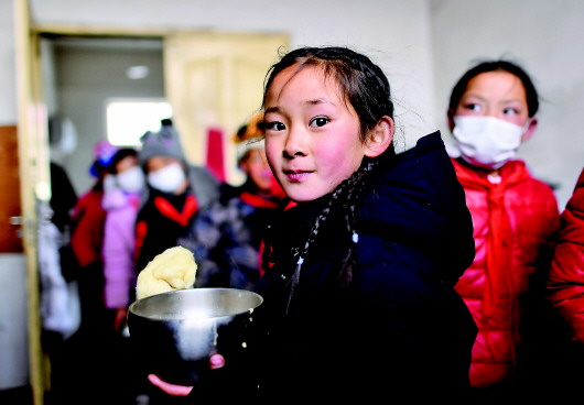 3月16日,在索加乡寄宿小学食堂,白玛措毛(前)和同学们一起打饭。