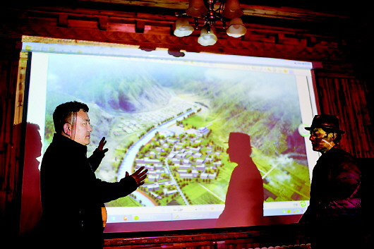 3月10日,在玉树市,尼玛(左)和当地传统藏式建筑技艺传承人成林江措讨论古村落修复规划。 |
